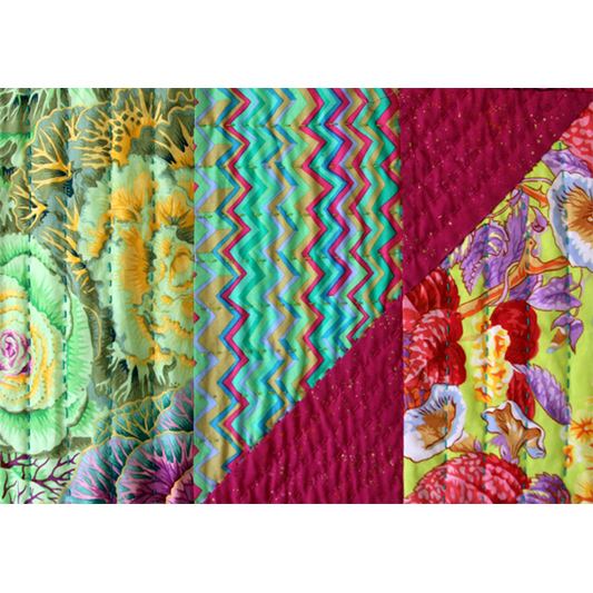 Make it as shown in a riot of bright floral and geometric fabrics of yellows, blues and greens and contrasting burgundy to create the twisted-ribbon effect, or let your imagination run wild and create your own exciting palette. Whatever you choose, this pattern makes a stunning and effective quilt.